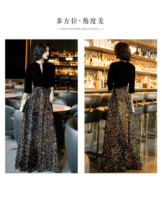 3/4-Sleeve Notch Neck Sequin Panel Evening Gown (Various Designs)