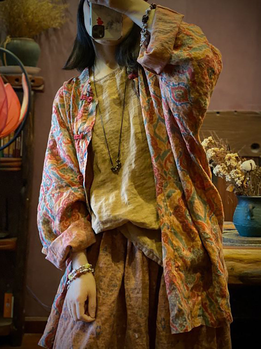 Damen Vintage Herbst Print 100% Leinen Button-up Mantel AH1015