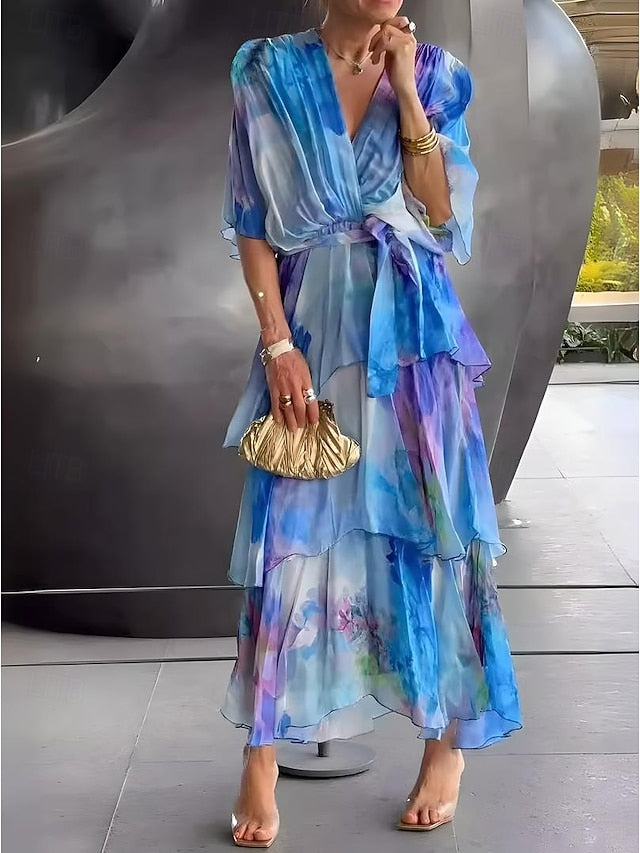 Dresses Type: A Line Dress, Fabric: Polyester, Gender: Women's, Design: Ruffle, Print, Layered, Occasion: Date, Style: Elegant, Formal, Fit Type: Regular Fit, Dress Length Type: Long Dress Maxi Dress, Neckline: V Neck, Sleeve Length: Half Sleeve, Elasticity: Micro-elastic, Look After Me: Machine wash, Pattern: Floral, Season: Summer,