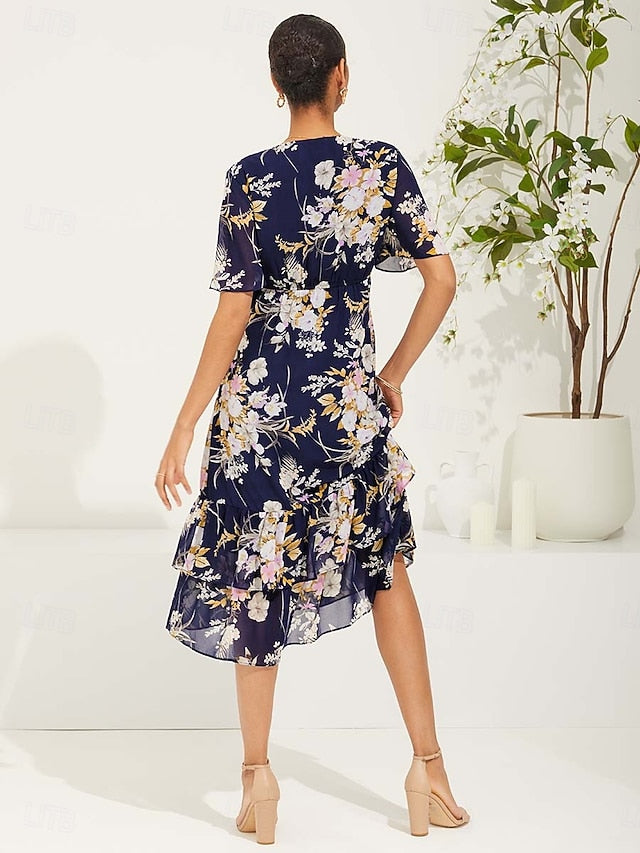 Dresses Type: Chiffon Dress, Fabric: Chiffon, Gender: Women's, Design: Ruffle, Occasion: Daily, Vacation, Date, Style: Elegant, Fit Type: Regular Fit, Dress Length Type: Tea Length, Neckline: V Neck, Sleeve Length: Short Sleeve, Sleeve Type: Flared Sleeve, Elasticity: Micro-elastic, Pattern: Floral, Season: Summer,