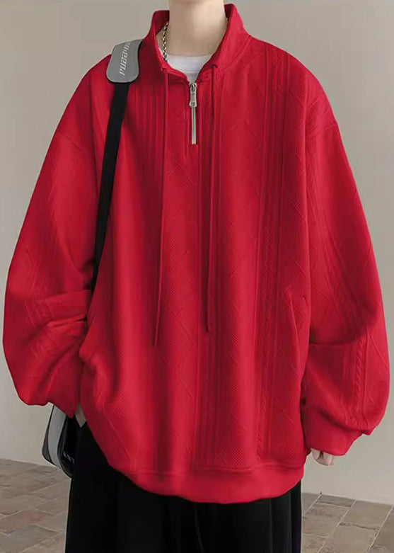 Simple Black Zip Up Pockets Solid Cotton Mens Sweatshirt Spring