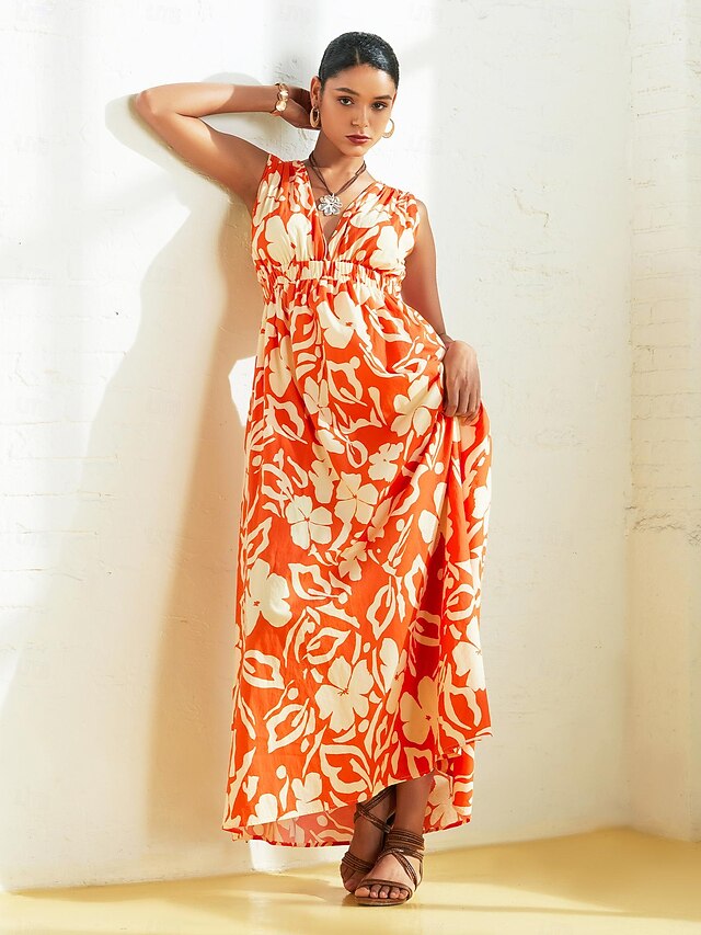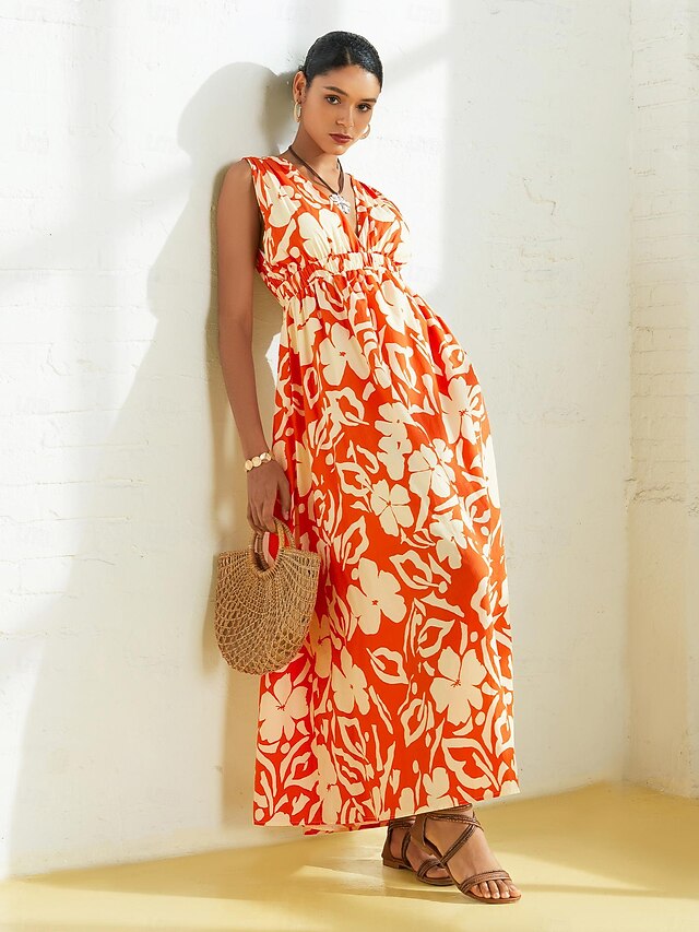 Dresses Type: Resort Wear, Fabric: Cotton, 195g Cotton, Gender: Women's, Occasion: Lawn, vacation dresses, Design: Tie Back, Style: beach vacation, Fabric Properties: Rayon Lining - Excellent sweat absorption and gives a graceful flow., CottonCloud - Naturally Breathable and moisture-wicking cotton, akin to airy clouds, super soft against skin., Trends: Print, Neckline: V Neck, Details: Without Pockets, Sleeve Length: Sleeveless, Sleeve Type: Sleeveless, Waistline: High , Elasticity: Inelastic, Look After Me: Machine wash, Wash with similar colours, Washable, Dress Length: Maxi, Pattern: Floral, Season: Spring & Summer, Special selected products: Clearance, Looseness: Loose Fit, Regular Fit, Inclusion: Elasticated Waistband,