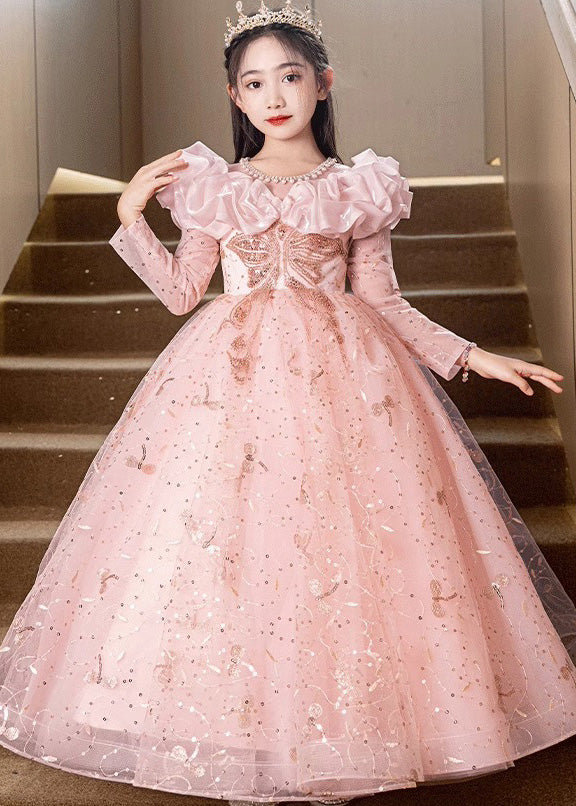 Indulge in the luxurious charm of our Fine Pink Embroideried Patchwork Tulle Kids Maxi Dress, perfect for the fall season.