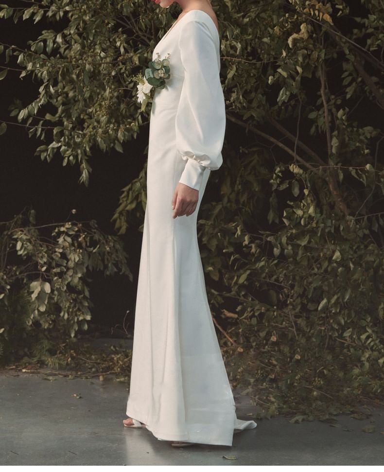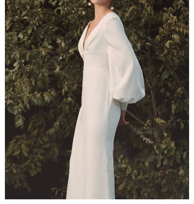 Long-Sleeve V-Neck Plunge Plain Open Back Satin Mermaid Wedding Gown