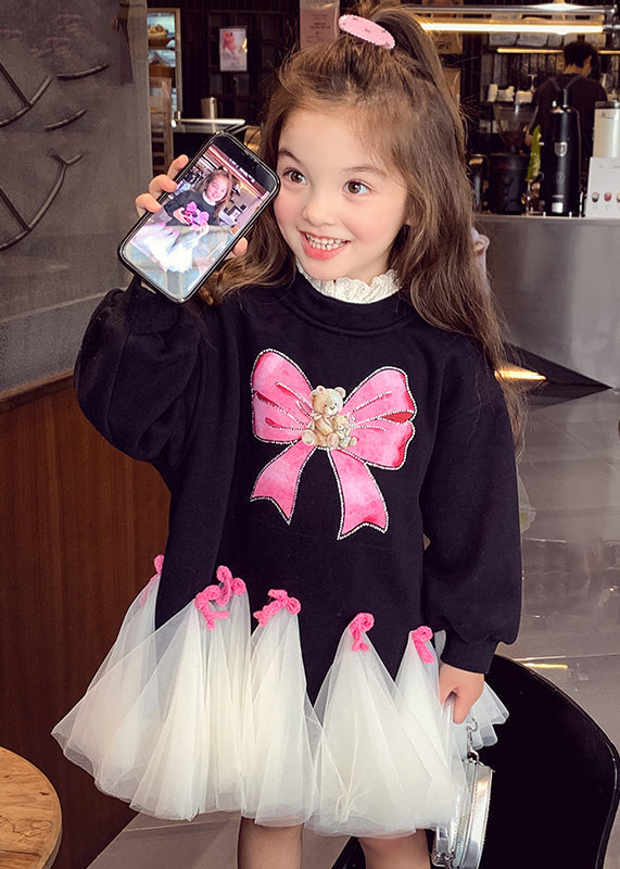 Cute Pink O-Neck Bow Tulle Patchwork Girls Maxi Dresses Spring TV030