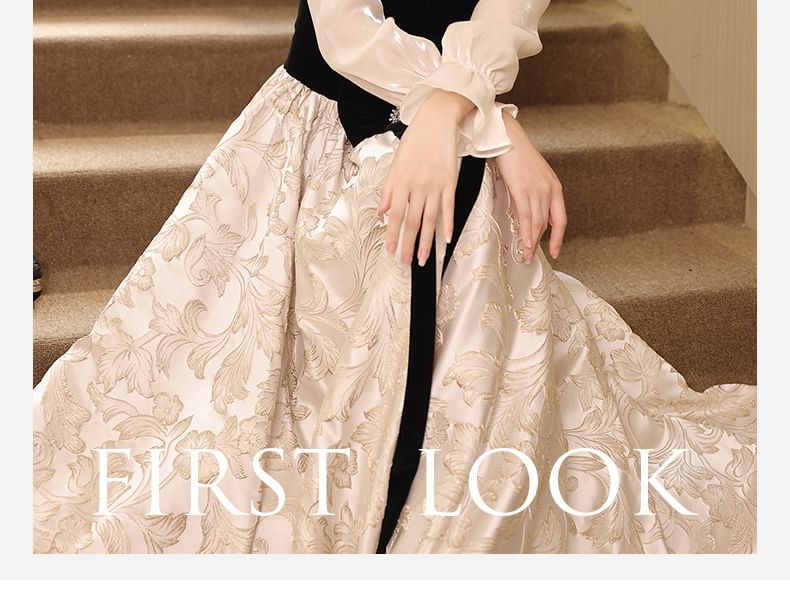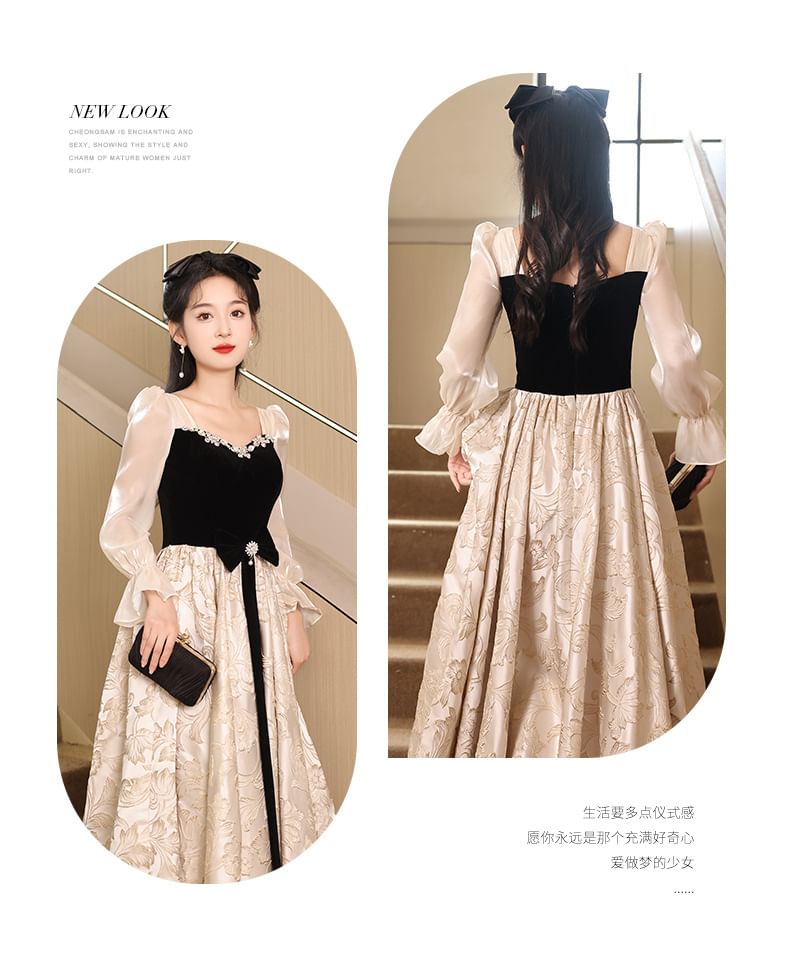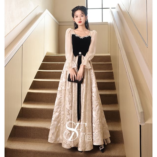 Long-Sleeve Square Neck Bow Rhinestone Panel Jacquard A-Line Evening Gown