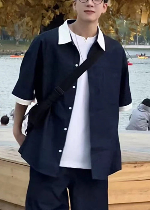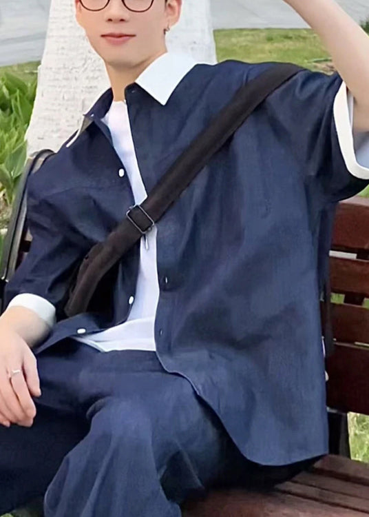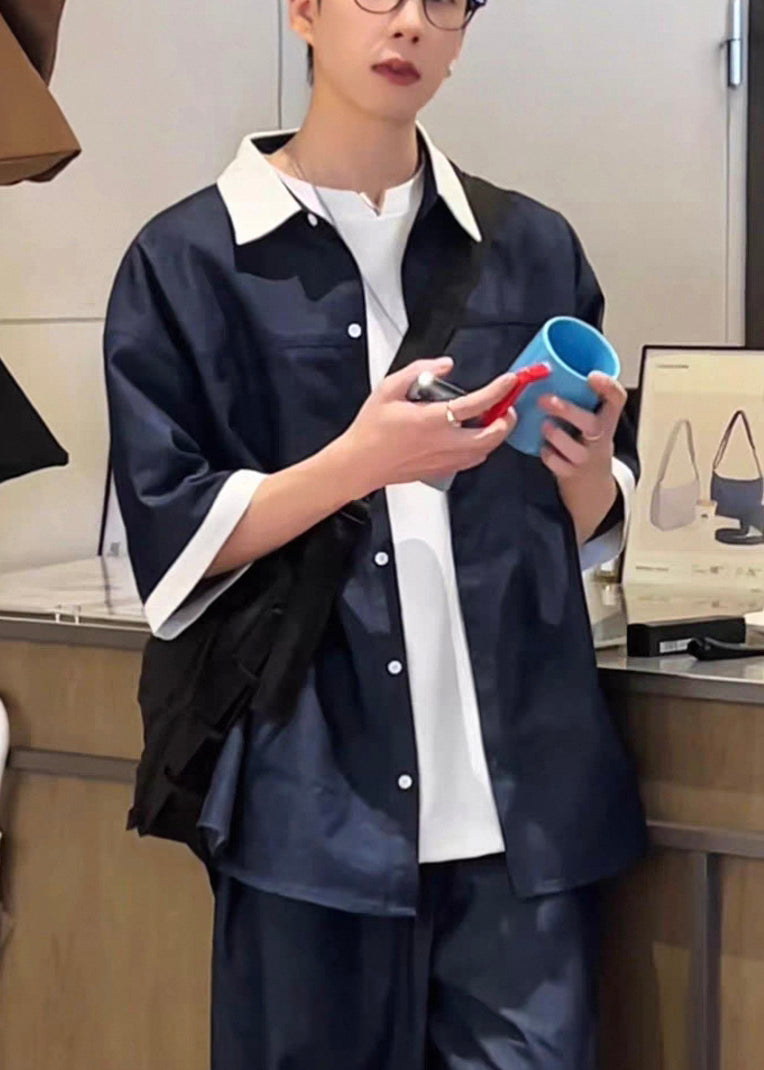 Loose Pan Patchwork Mens Collar Peter Summer Shirts Navy Denim