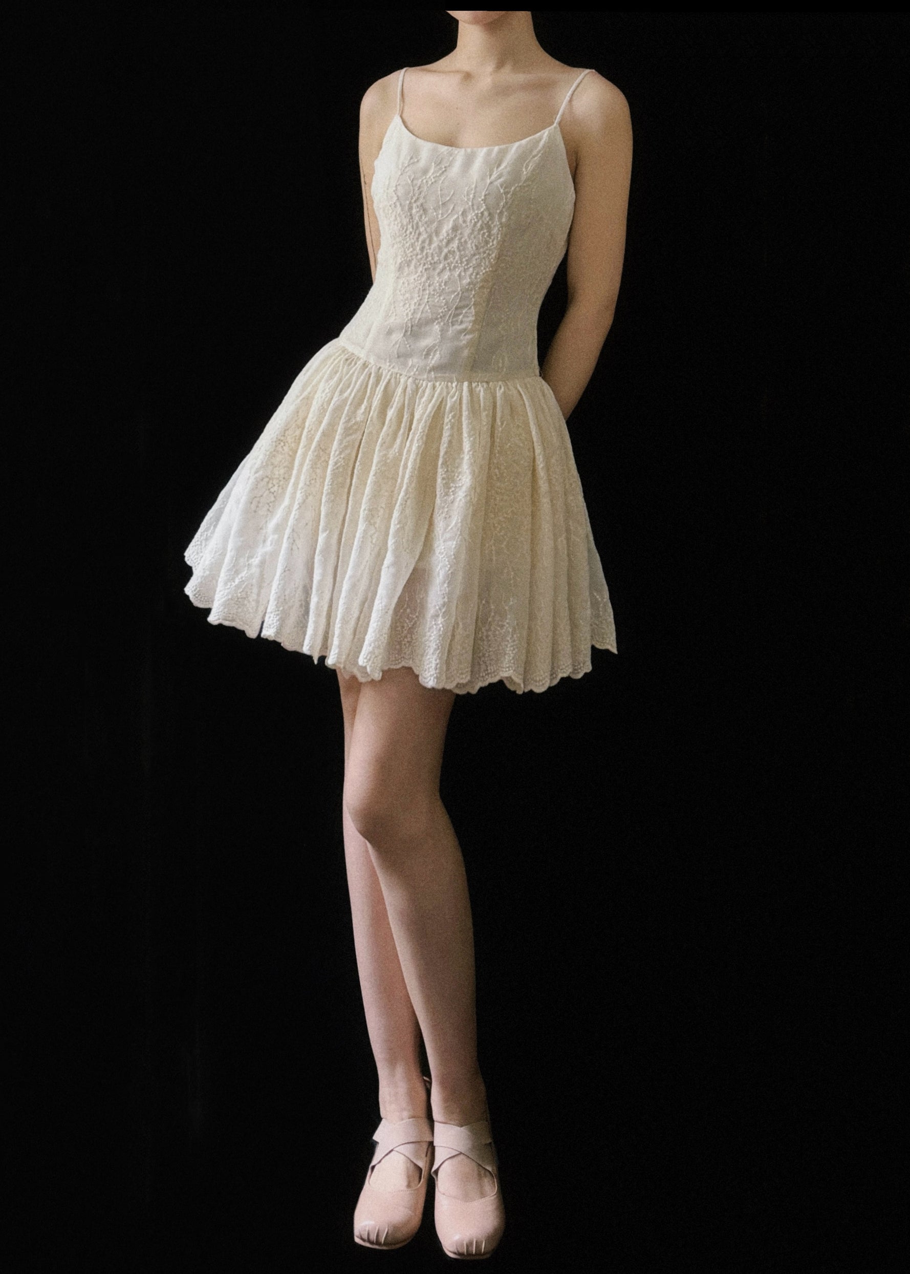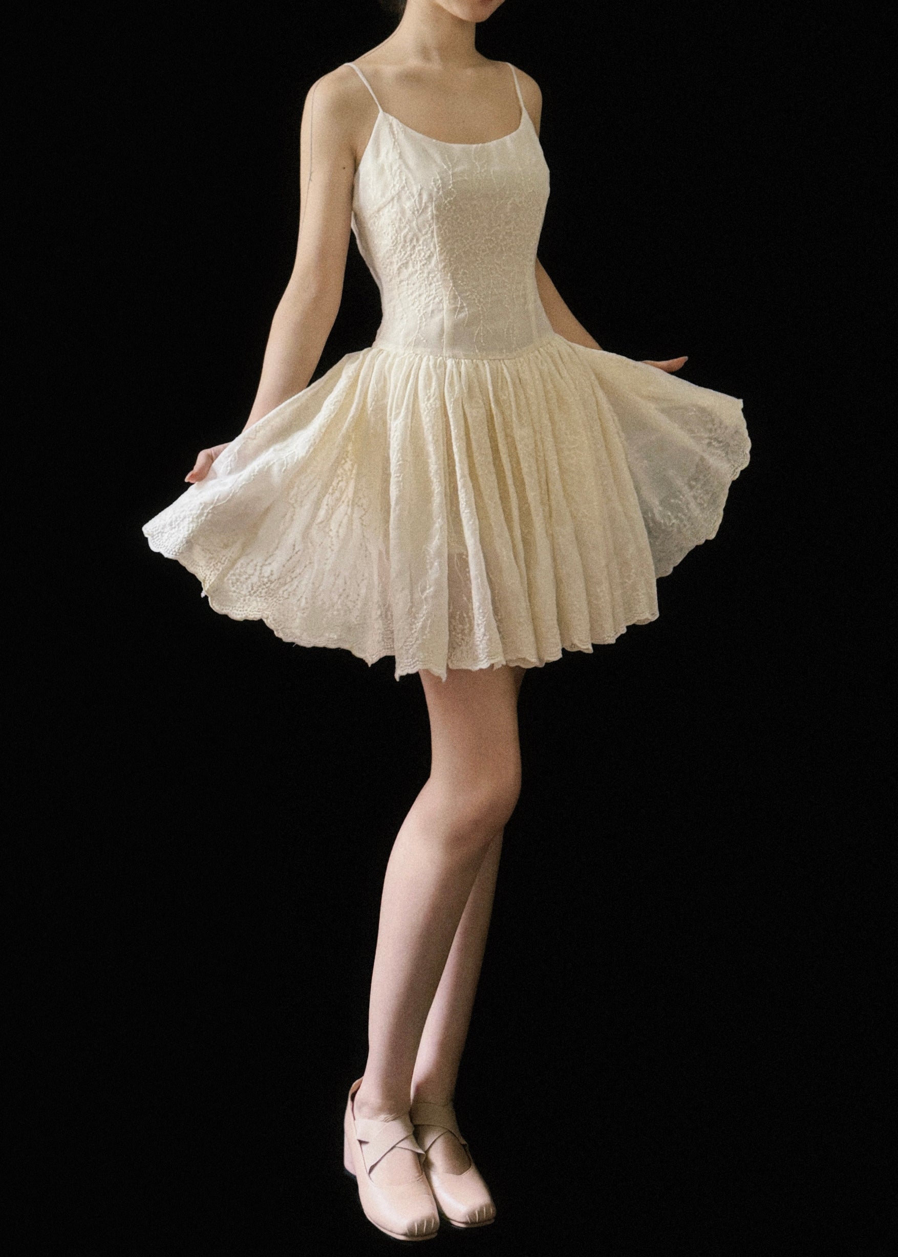 New Beige Dresses Cotton Sleeveless Wrinkled Mini Embroidered