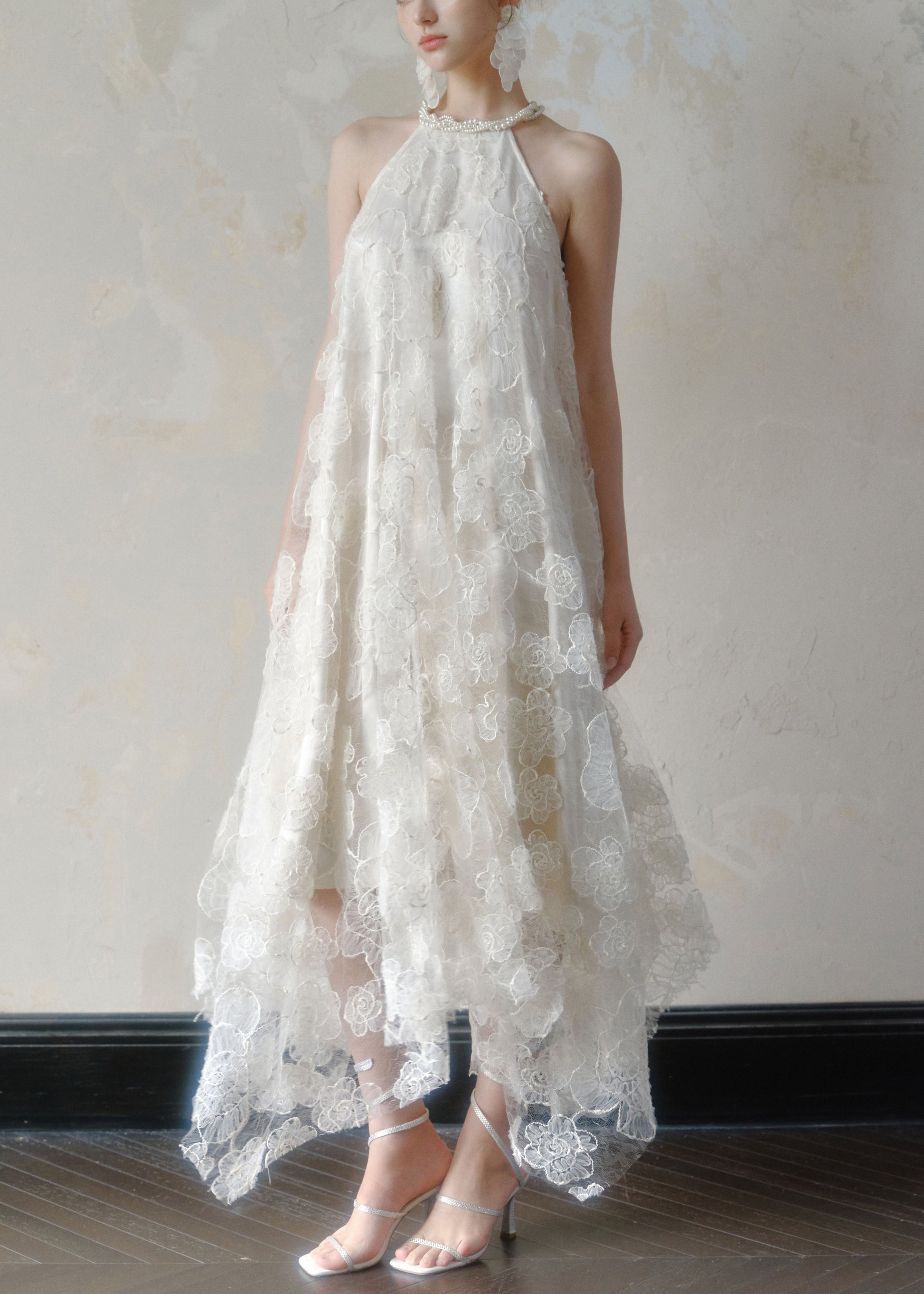 Pearl Lace Sleeveless Asymmetrical Art Long Dress White