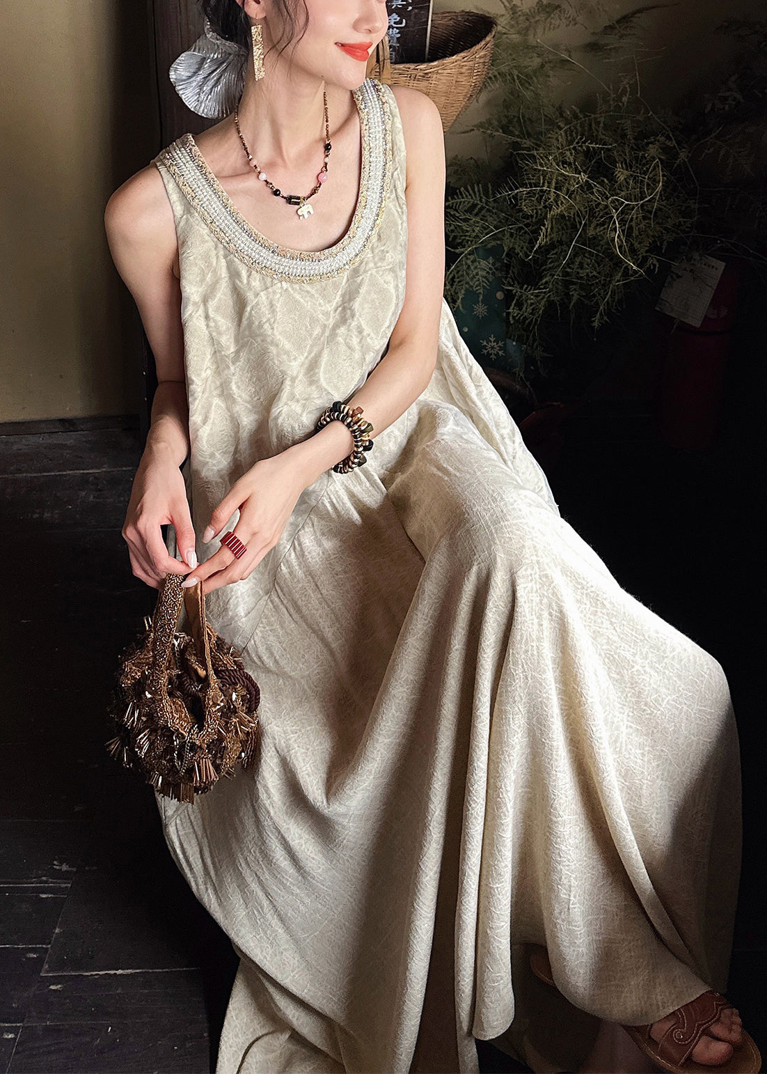 French Apricot O Neck Pockets Patchwork Cotton Long Dress Sleeveless
