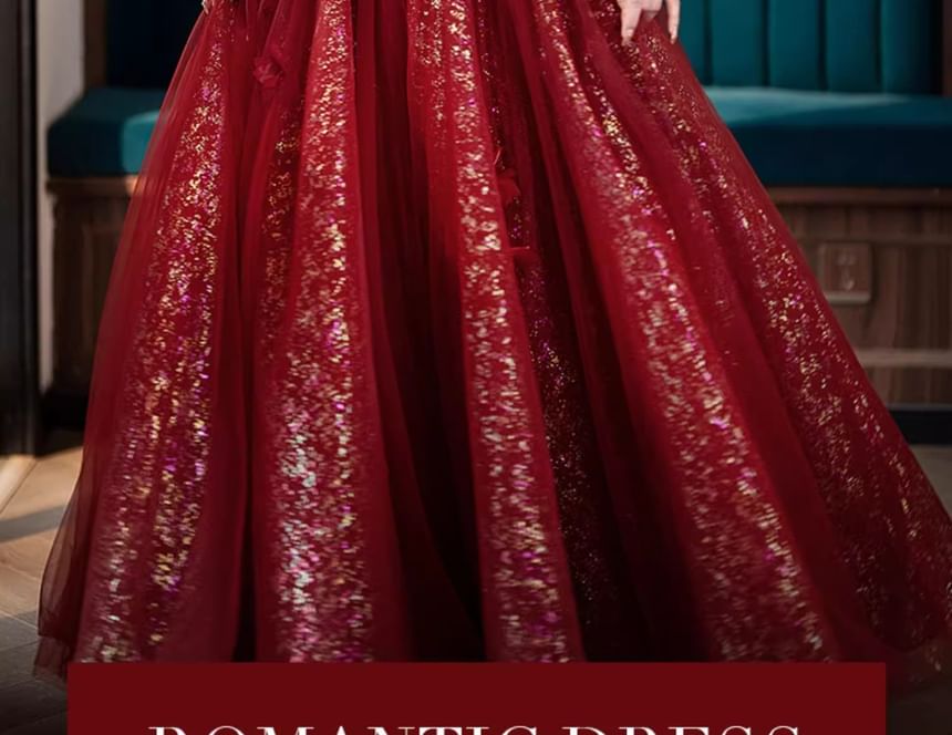 Short-Sleeve Flower Accent Sequin A-Line Evening Gown