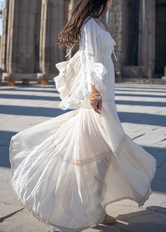 Art Beige Wrinkled Lace Up Cotton Long Dress Flare Sleeve