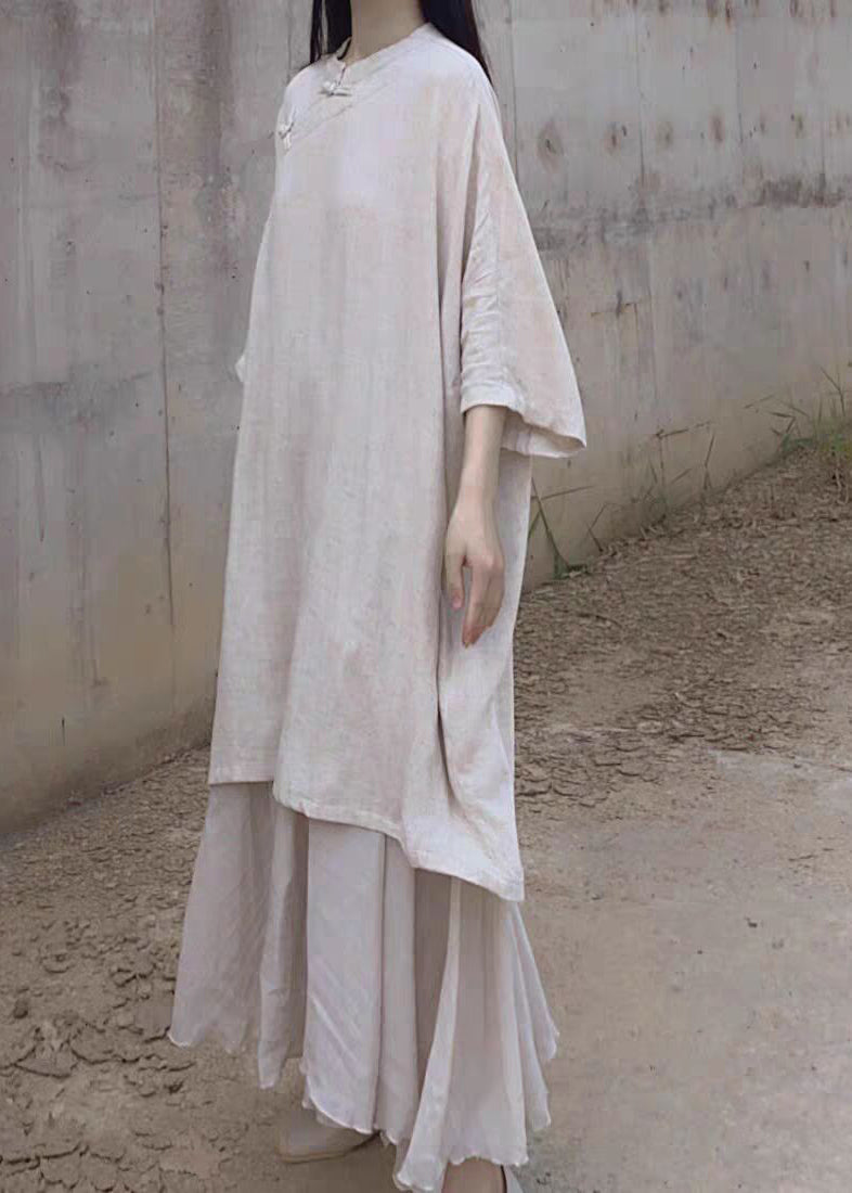 Vintage Beige Stand Collar Oriental Button Linen Long Dress Bracelet Sleeve RU032