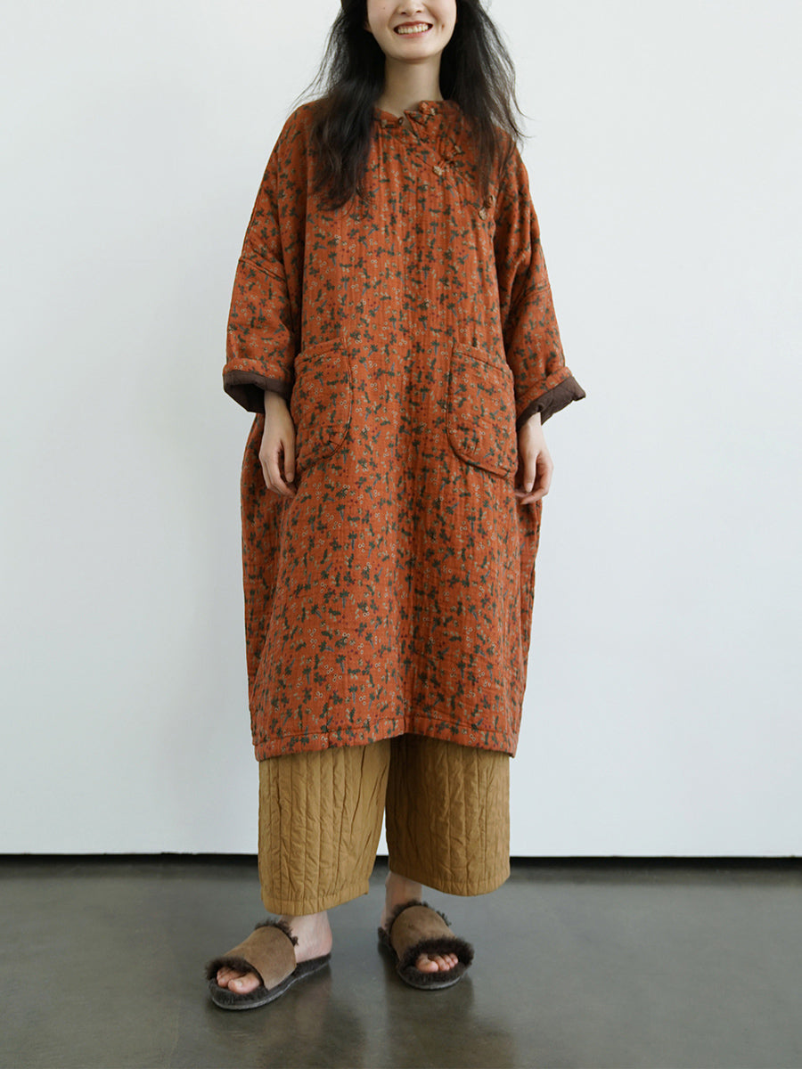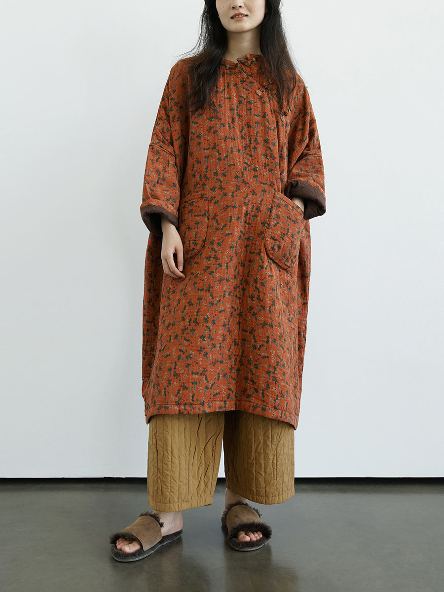 Women Vintage Floral Stand Collar Cotton Robe Dress QU004