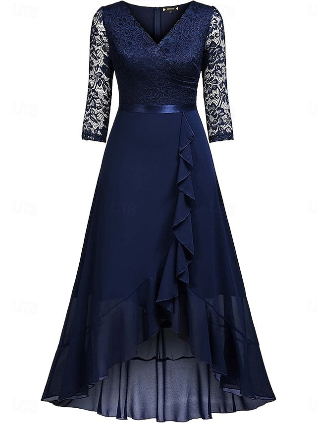 Dresses Type: A Line Dress, Fabric: Polyester, Gender: Women's, Design: High Low dress, Ruffle, Lace, Occasion: Work, Formal, Style: Party, Formal, Print Type: non-printing, Fit Type: Regular Fit, Dress Length Type: Maxi Dress, Neckline: V Neck, Sleeve Length: 3/4 Length Sleeve, Elasticity: Inelastic, Look After Me: Hand wash, Machine wash, Pattern: Plain, Season: Fall, Summer, Spring,
