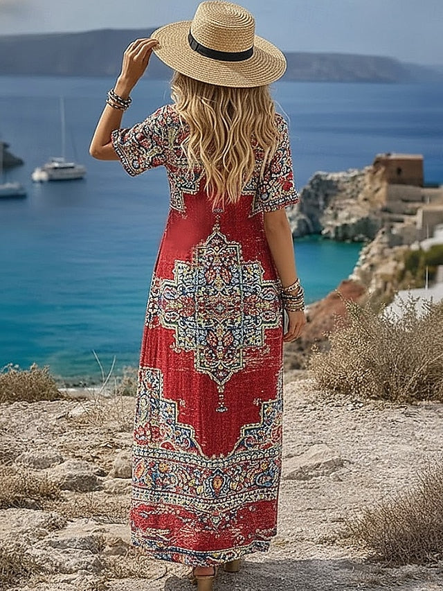 Dresses Type: A Line Dress, Fabric: Polyester, Gender: Women's, Design: Print, Occasion: Daily, Style: Casual, Fit Type: Loose Fit, Dress Length Type: Maxi Dress, Neckline: V Neck, Sleeve Length: Short Sleeve, Elasticity: Inelastic, Look After Me: Machine wash, Pattern: Graphic, Geometric, Season: Spring, Summer,
