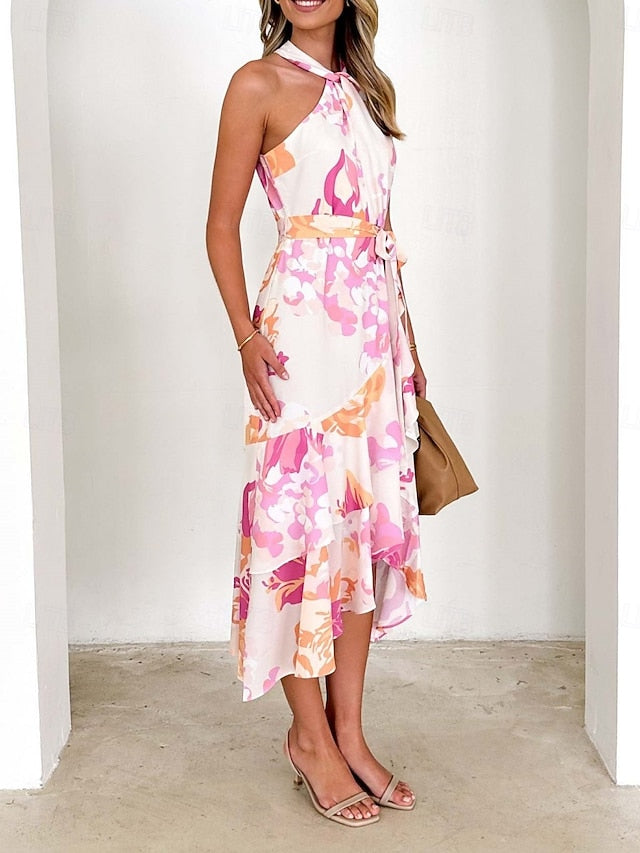 Dresses Type: A Line Dress, Fabric: Polyester, Gender: Women's, Design: Print, Occasion: Outdoor, Going out, Style: Casual, Vacation, Print Type: Print, Fit Type: Regular Fit, Dress Length Type: Maxi Dress, Neckline: Halter Neck, Sleeve Length: Sleeveless, Thickness: Thin, Elasticity: Inelastic, Look After Me: Hand wash, Machine wash, Pattern: Floral, Season: Summer, Spring,