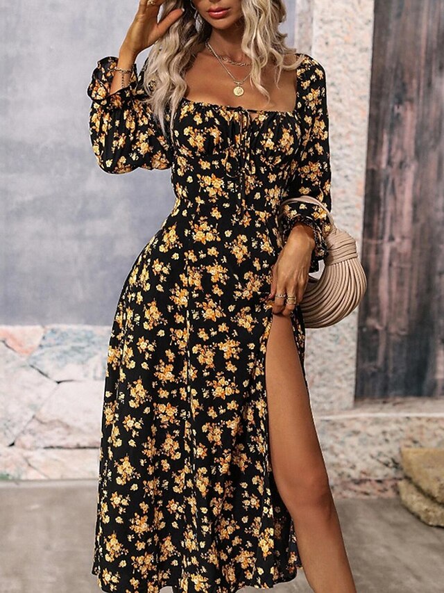 Dresses Type: Milkmaid Dress, Summer Dress, Casual Dress, Swing Dress, A Line Dress, Fabric: Polyester, Gender: Women's, Occasion: Vacation, Street, Holiday, Design: Print, Split, Style: A Line, Streetwear, Fit Type: Regular Fit, Dress Length Type: Maxi Dress, Neckline: Square Neck, Sleeve Length: Long Sleeve, Elasticity: Micro-elastic, Look After Me: Machine wash, Pattern: Floral, Season: Summer,