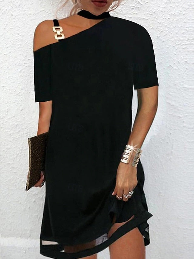 Dresses Type: Plain Dress, Formal Dresses, Cocktail Dress, Black Dress, Fabric: Polyester, Gender: Women's, Design: Patchwork, Mesh, Occasion: Date, Street, Style: Vintage, Casual, Print Type: non-printing, Fit Type: Loose Fit, Dress Length Type: Midi Dress, Neckline: One Shoulder, Sleeve Length: Short Sleeve, Elasticity: Micro-elastic, Look After Me: Wash separately, Machine wash, Pattern: Plain, Season: Spring, Summer,