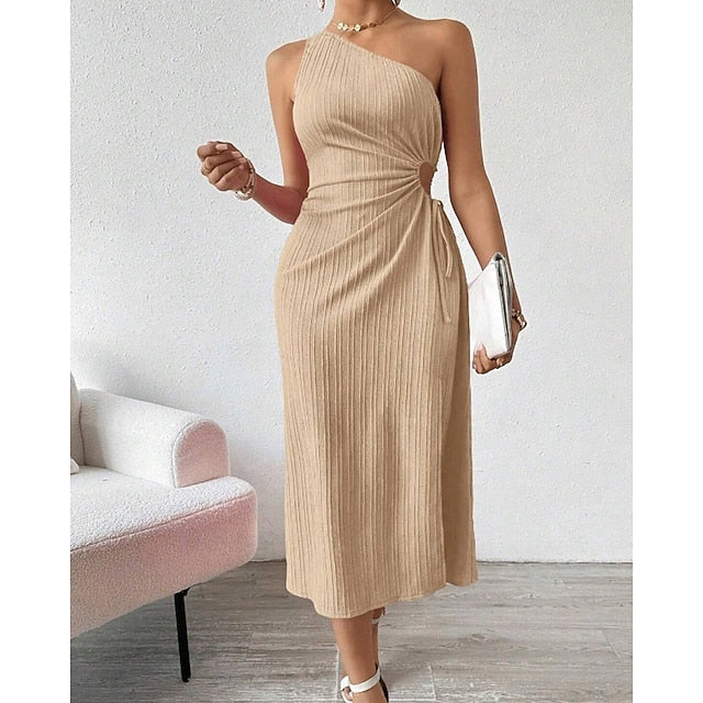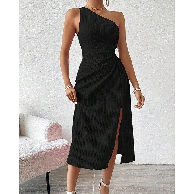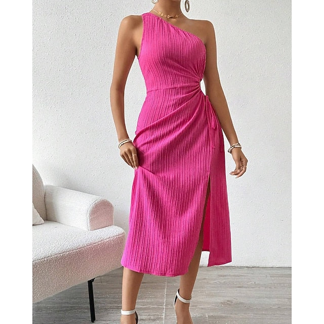 Dresses Type: Cocktail Dress, Party Dress, Prom Dress, Fabric: Polyester, Gender: Women's, Design: Cold Shoulder, Split, Backless, Occasion: Special Occasion, Party, Evening Party, Cocktail Party, Style: Elegant, Modern, Fashion, Fit Type: Loose Fit, Dress Length Type: Midi Dress, Neckline: One Shoulder, Sleeve Length: Sleeveless, Elasticity: Stretchy, Look After Me: Hand wash, Pattern: Plain, Season: Summer, Spring,