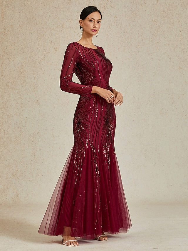 Dresses Type: Sheath Dress, Fabric: Lace, Gender: Women's, Design: Mesh, Sequins, Occasion: Evening Party, Size Suggestion: standard size, select your usual size, Style: Elegant, Dress Length Type: Maxi Dress, Neckline: Crew Neck, Sleeve Length: Long Sleeve, Elasticity: Inelastic, Look After Me: Dry clean only, Pattern: Solid Color, Season: Winter, Fall,