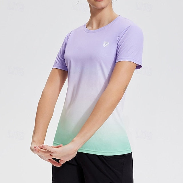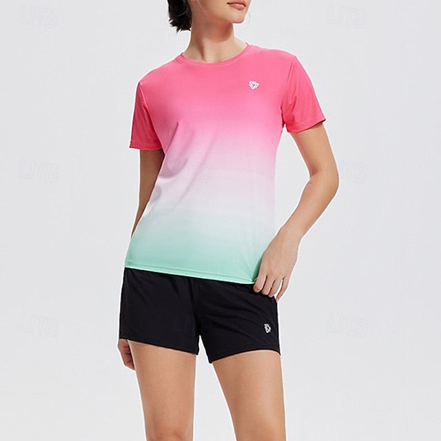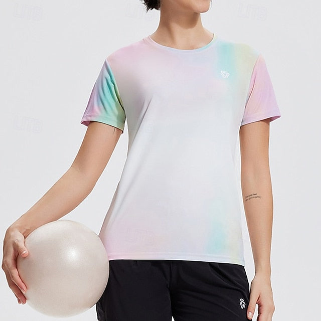 Gender: Women's, Sports Clothing Sub Category: Yoga Top, Clothing Type: Top, Activity: Yoga, Running, Fitness, Gym Workout, Dance, Pickleball, Season: Summer, Elasticity: Micro-elastic, Function: Breathable, Quick Dry, Fabric: Polyester, Sleeve Length: Short Sleeve, Neckline: Crew Neck, Pattern: Color Gradient, Bust (cm): S:84;M:88;L:92;XL:96;XXL:100;XXXL:104, Length (cm): S:59;M:61;L:63;XL:65;XXL:67;XXXL:69,
